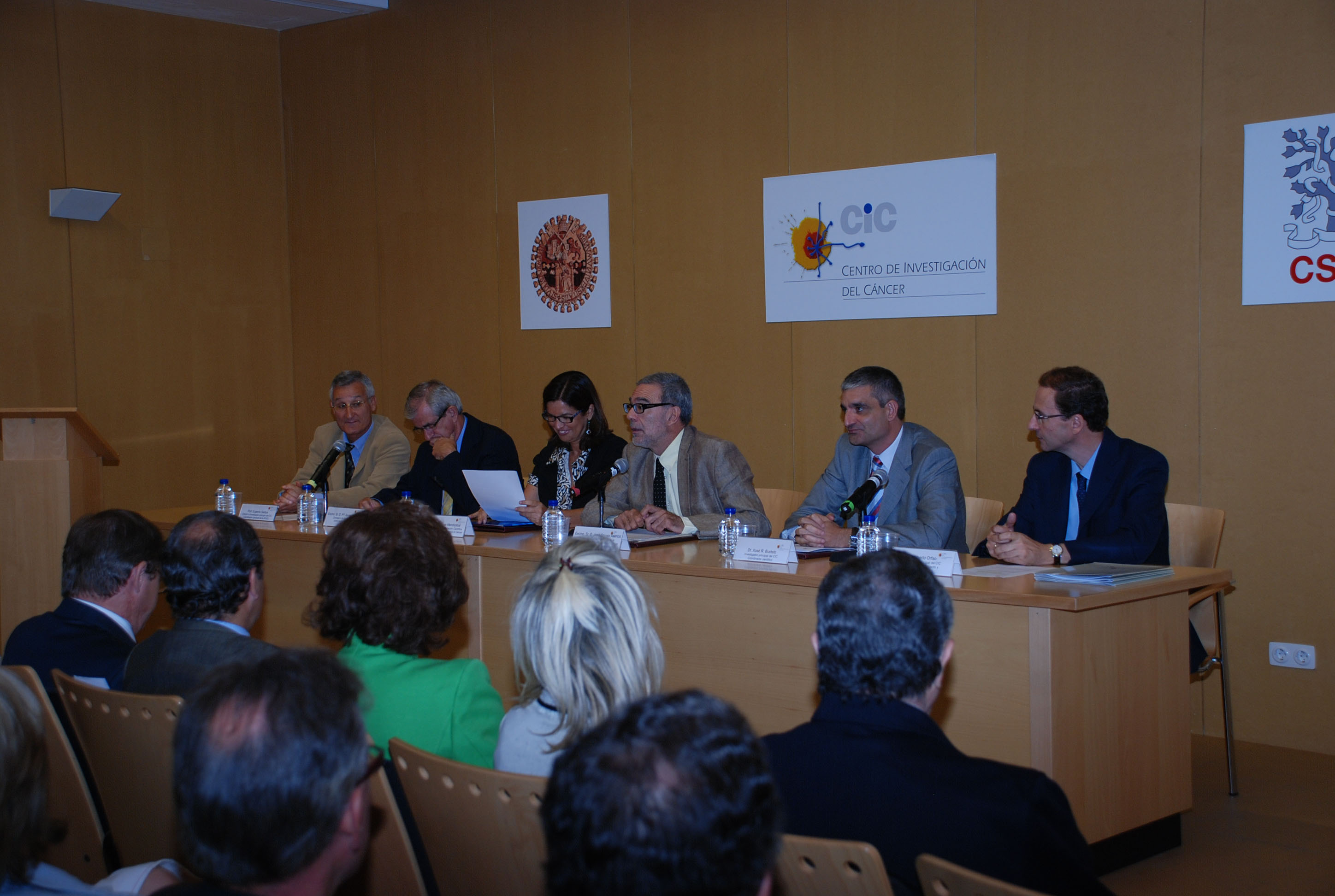 El acto celebrado en la mañana de hoy contó con la presencia de José Gómez Asencio, rector de la Universidad de Salamanca; Francisco Javier Álvarez Guisasola, consejero de Sanidad de la Junta de Castilla y León; Pilar Perote Mendizábal, vicepresidenta de la Fundación Científica de la Asociación Española Contra el Cáncer; el director del Centro del Cáncer, Eugenio Santos; el coordinador científico del proyecto Xosé Bustelo; y el investigador Alberto Orfao.
