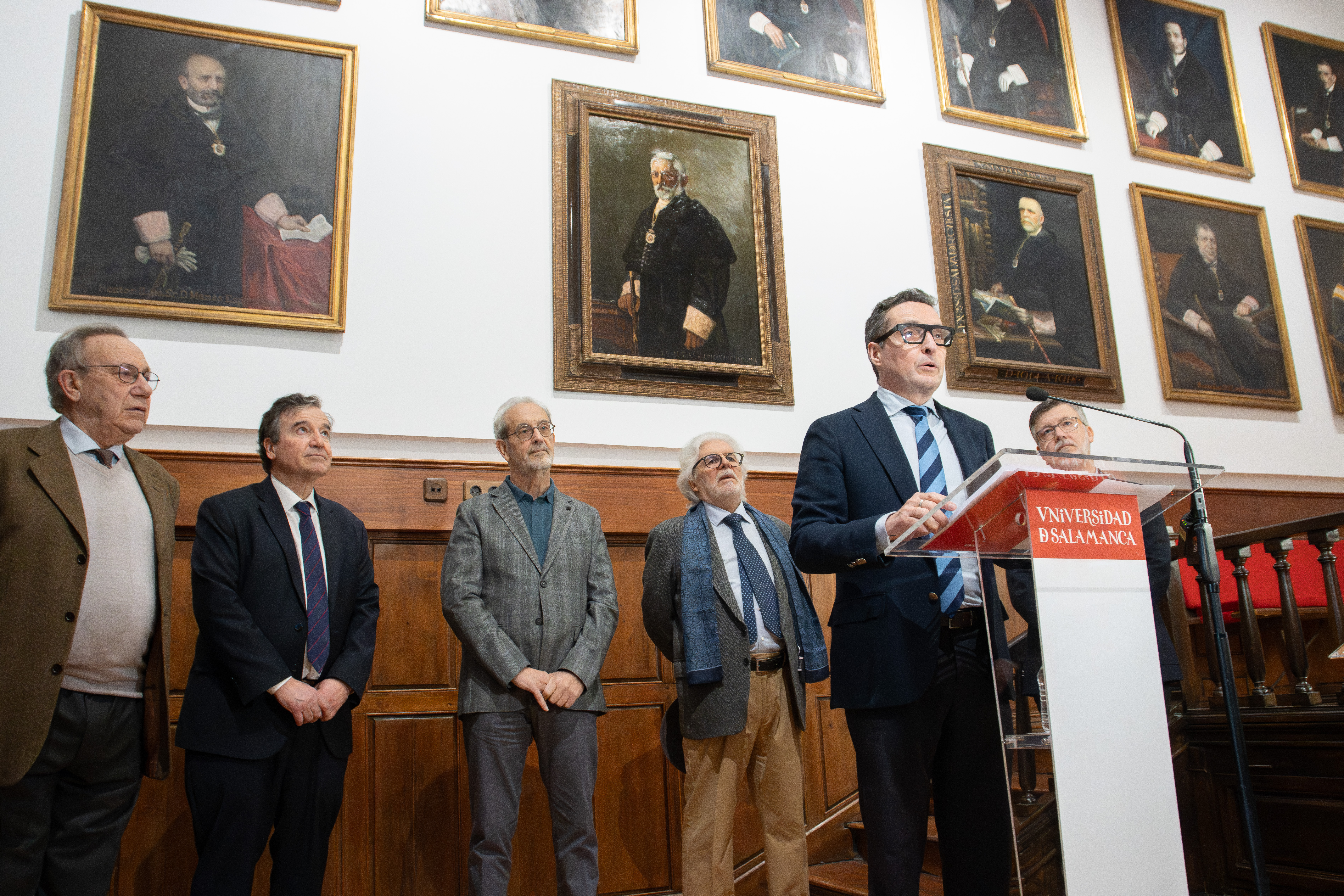 La nueva Galería de Retratos de Rectores de la Universidad de Salamanca ha quedado abierta al público en la mañana de hoy en el Aula Alfonso X El Sabio de las Escuelas Mayores. El acto de inauguración, presidido por el rector Juan Manuel Corchado, ha contado con la presencia de los exrectores Enrique Battaner, José Ramón Alonso y Daniel Hernández Ruipérez y del artista Eusebio Sánchez Blanco, junto a miembros del equipo de Gobierno y de autoridades académicas.