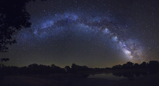 Texto presentado con la fotografía: La Vía Láctea es una galaxia espiral donde se encuentra el Sistema Solar y, por tanto, nuestro planeta. La Vía Láctea tiene un diámetro aproximado de 100.000 años luz y tiene una masa de más de dos billones de veces la del Sol. Se estima que tiene entre 200.000 y 400.000 millones de estrellas. Está compuesta de tres partes: el halo, el disco y el bulbo. Nuestra galaxia forma parte del Grupo Local que consta de 40 galaxias entre las que se encuentra Andrómeda, visible en la parte inferior izquierda de la fotografía. La fotografía se realizó en un lugar alejado de las luces del pueblo más cercano y consta en realidad de 6 imágenes unidas para formar una panorámica de la Vía Láctea de norte a sur pasando por las constelaciones de Perseo, Casiopea, Cefeo, el Cisne, Lira y Ofiuco, entre otras.