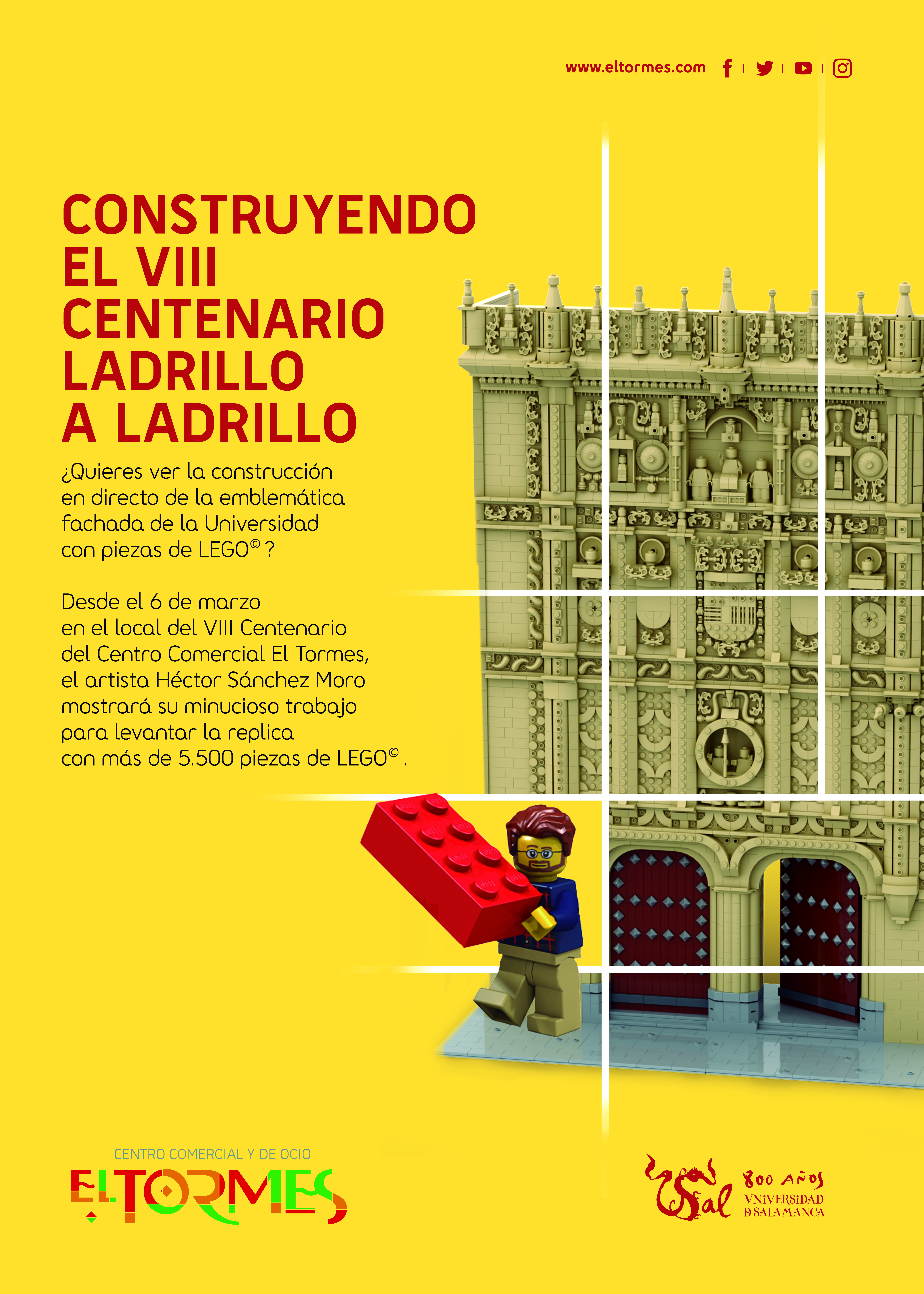 La fachada plateresca del Edificio de las Escuelas Mayores de la Universidad de Salamanca, icono de la ciudad y de su Estudio, lucirá antes de la Semana Santa en una reproducción con piezas de LEGO© gracias la colaboración de la Oficina del VIII Centenario y del Centro Comercial El Tormes, que patrocina esta iniciativa.