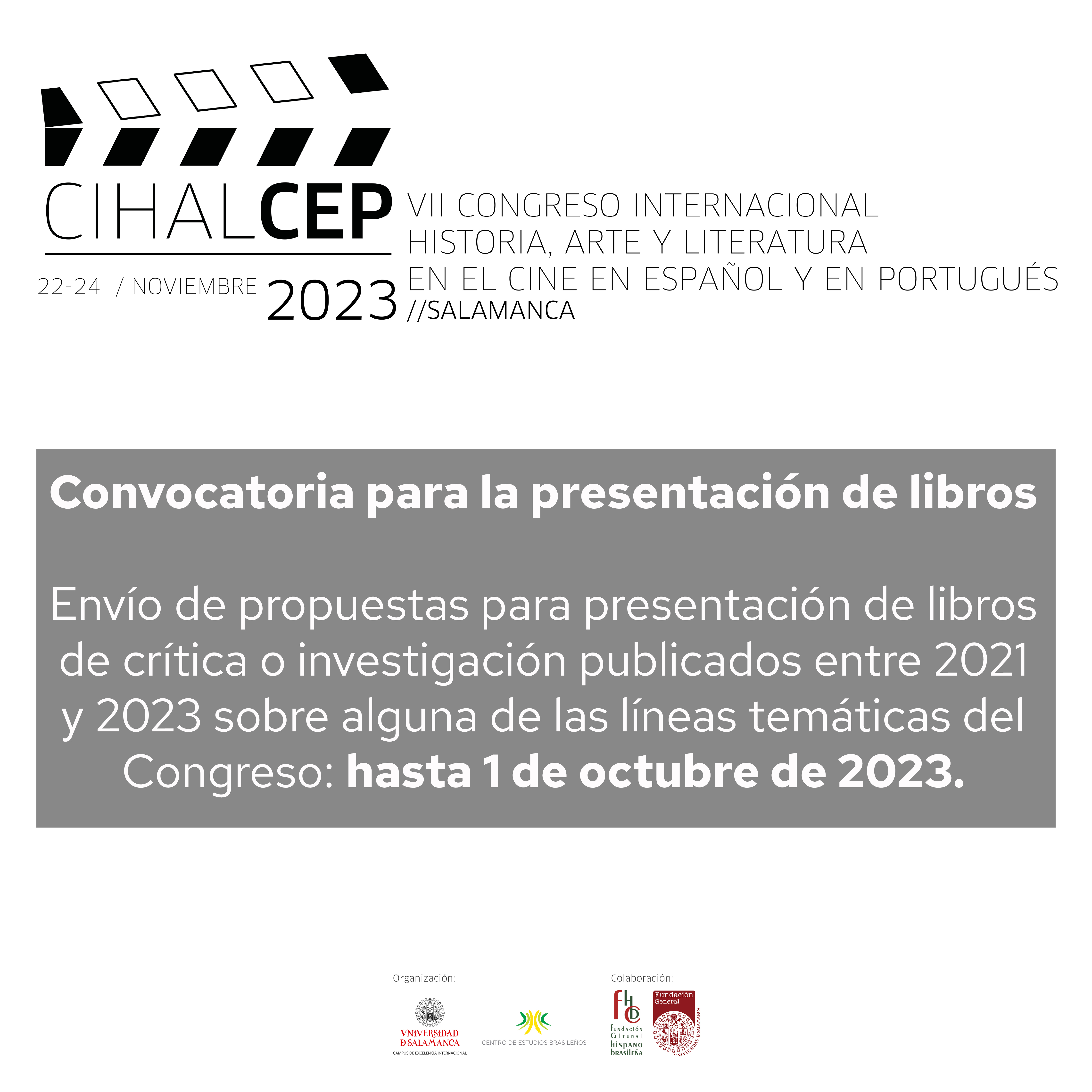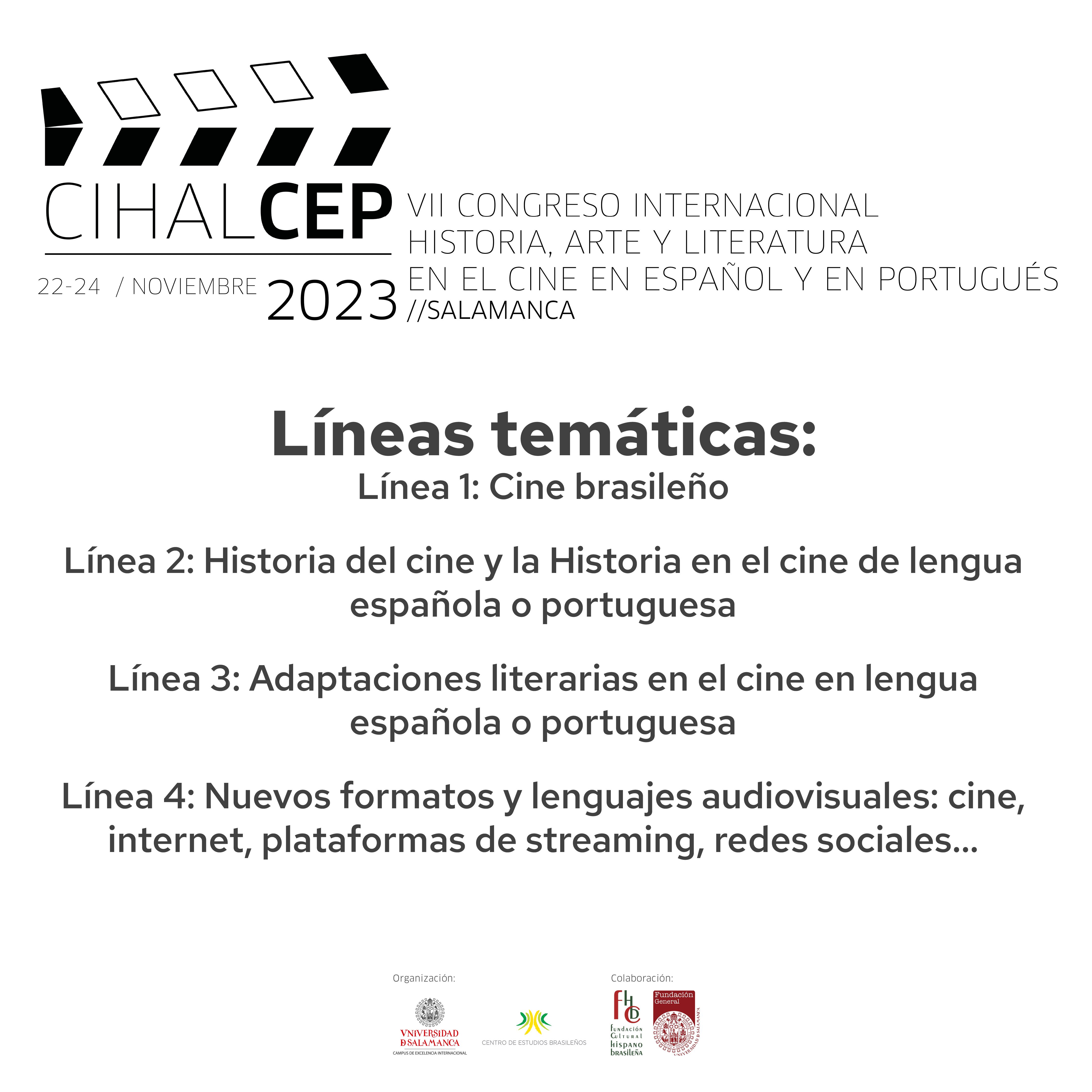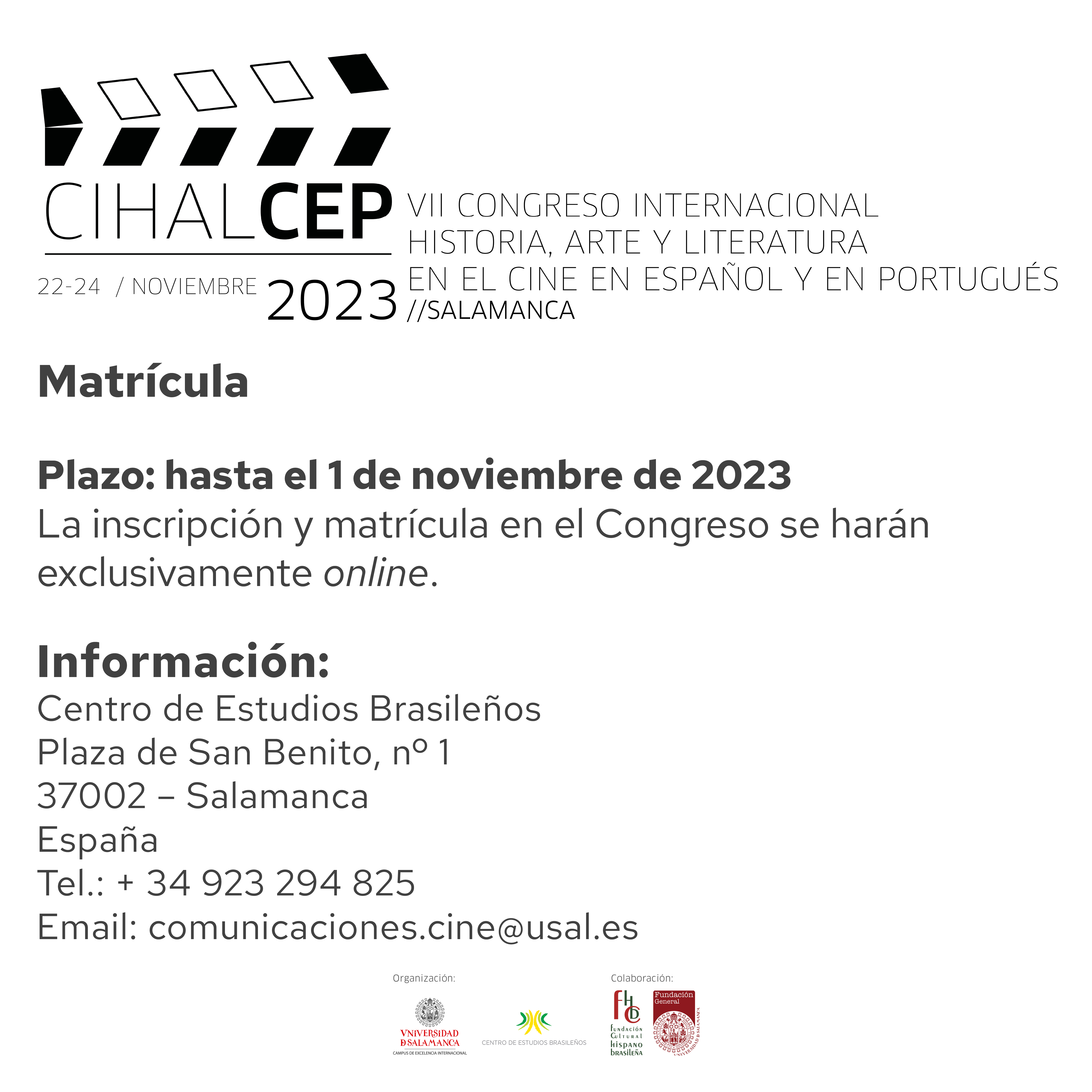 El Centro de Estudios Brasileños de la USAL, con el apoyo de la Fundación Cultural Hispano Brasileña, organiza desde 2011 y con carácter bianual el Congreso Internacional de Historia, Arte y Literatura en el Cine en Español y en Portugués – CIHALCEP, que en esta edición recupera su carácter presencial y que se celebrará del 22 al 24 de noviembre la Facultad de Geografía e Historia.