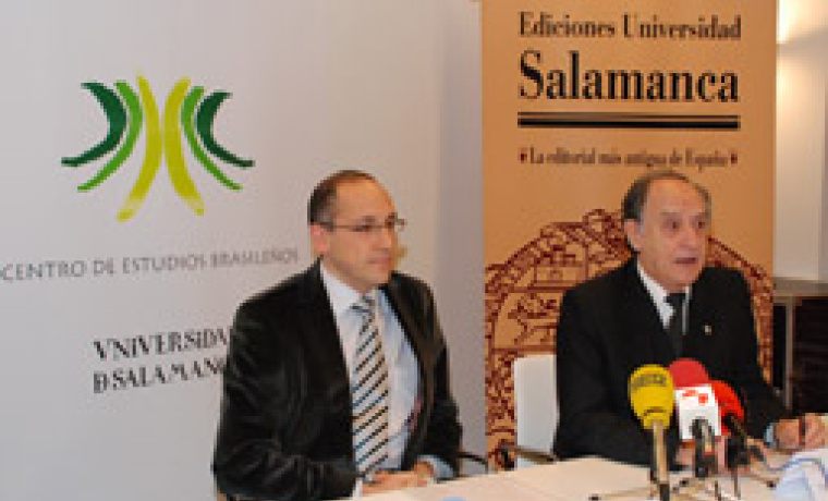 Gonzalo Gómez Dacal, director del Centro de Estudios Brasileños, y Pedro Javier Pardo, director en funciones de Ediciones Universidad de Salamanca, han firmado esta mañana un convenio de colaboración.