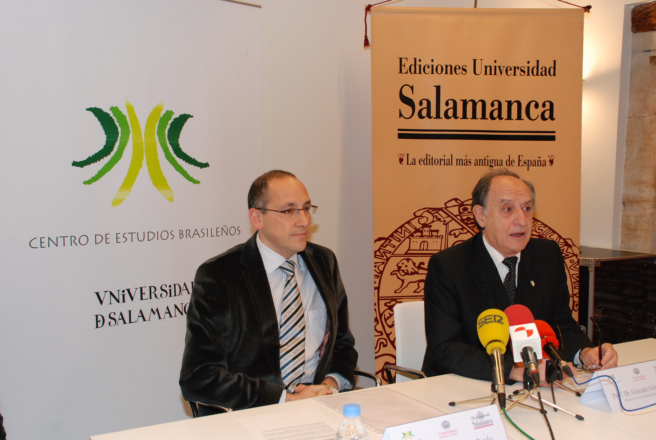 Salamanca, 24 de febrero de 2010. Gonzalo Gómez Dacal, director del Centro de Estudios Brasileños, y Pedro Javier Pardo, director en funciones de Ediciones Universidad de Salamanca, han firmado esta mañana un convenio de colaboración por el que se crea una nueva colección dedicada a la Literatura Hispano Brasileña.