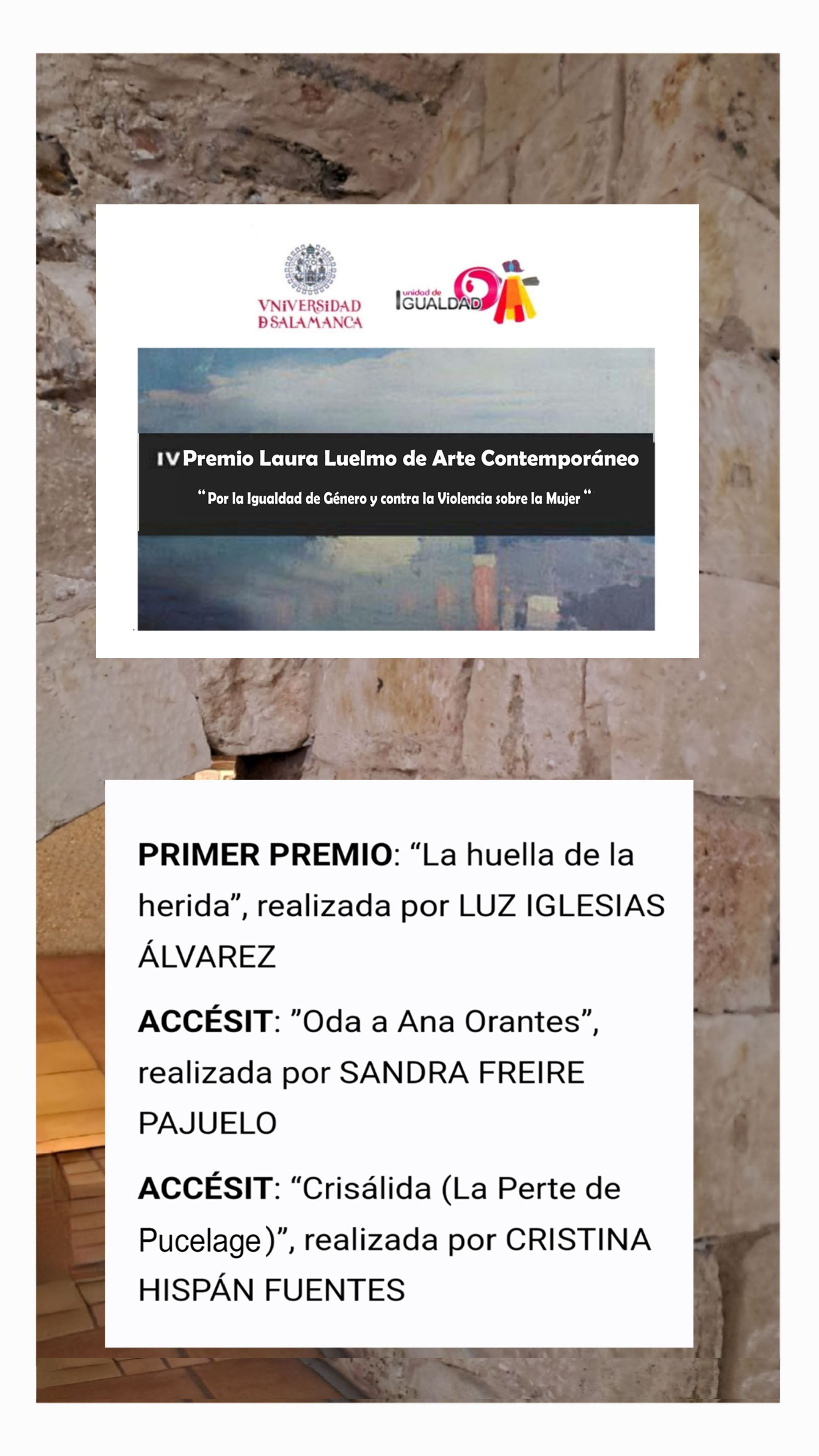 Tres estudiantes de la USAL han sido galardonadas en esta edición. Luz Iglesias Álvarez ha obtenido el primer premio por “La huella de la herida”, y también se han reconocido los trabajos de Sandra Freire Pajuelo y Cristina Hispán Fuentes con sendos accésits por sus obras “Oda a Ana Orantes” y “Crisálida (La Perte de Pucelage)”.