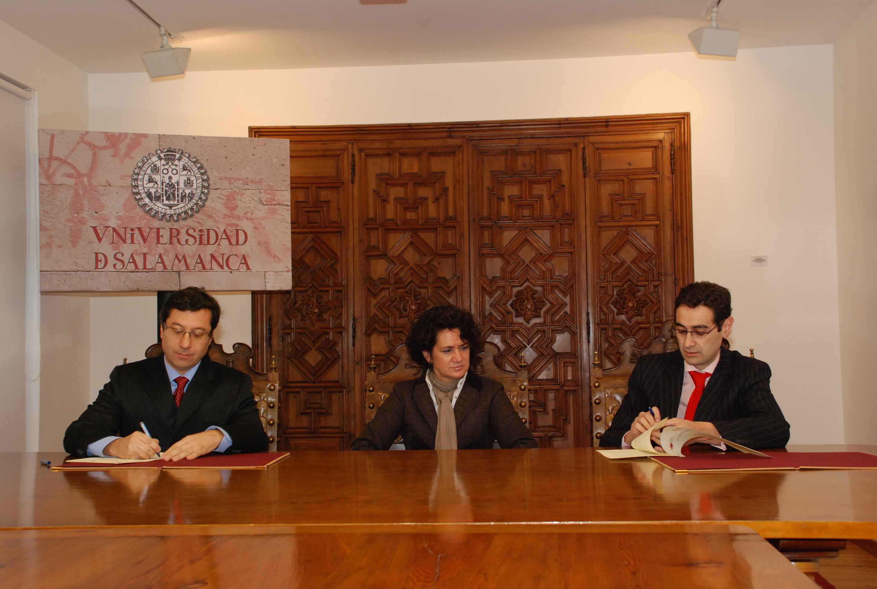 Salamanca, 10 de diciembre de 2010. La Fundación del Parque Científico de la Universidad de Salamanca ha suscrito esta mañana en la Sala de Retratos del Rectorado un convenio de colaboración con la empresa Interra para la cesión de espacios destinados a la implantación de la sede de la compañía en el Edificio M2 del Parque.