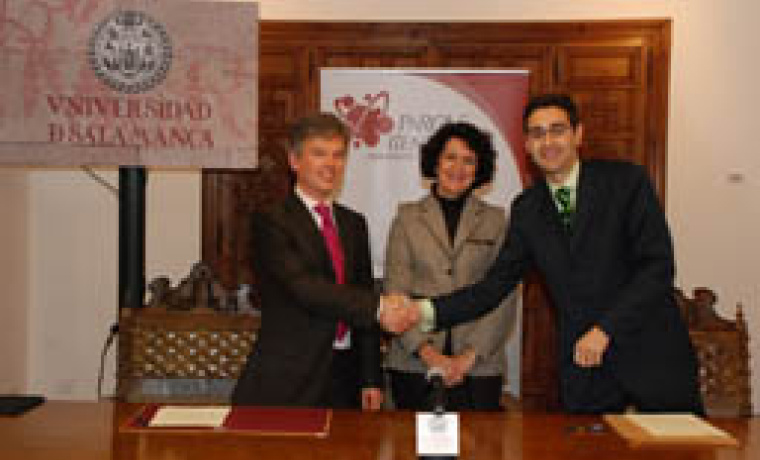El gerente de la Fundación Parque Científico de la Universidad de Salamanca, José Miguel Sánchez Llorente, y el consejero delegado de la empresa Unkasoft, Jaime Lanchares Sánchez, han firmado esta mañana un convenio de colaboración.