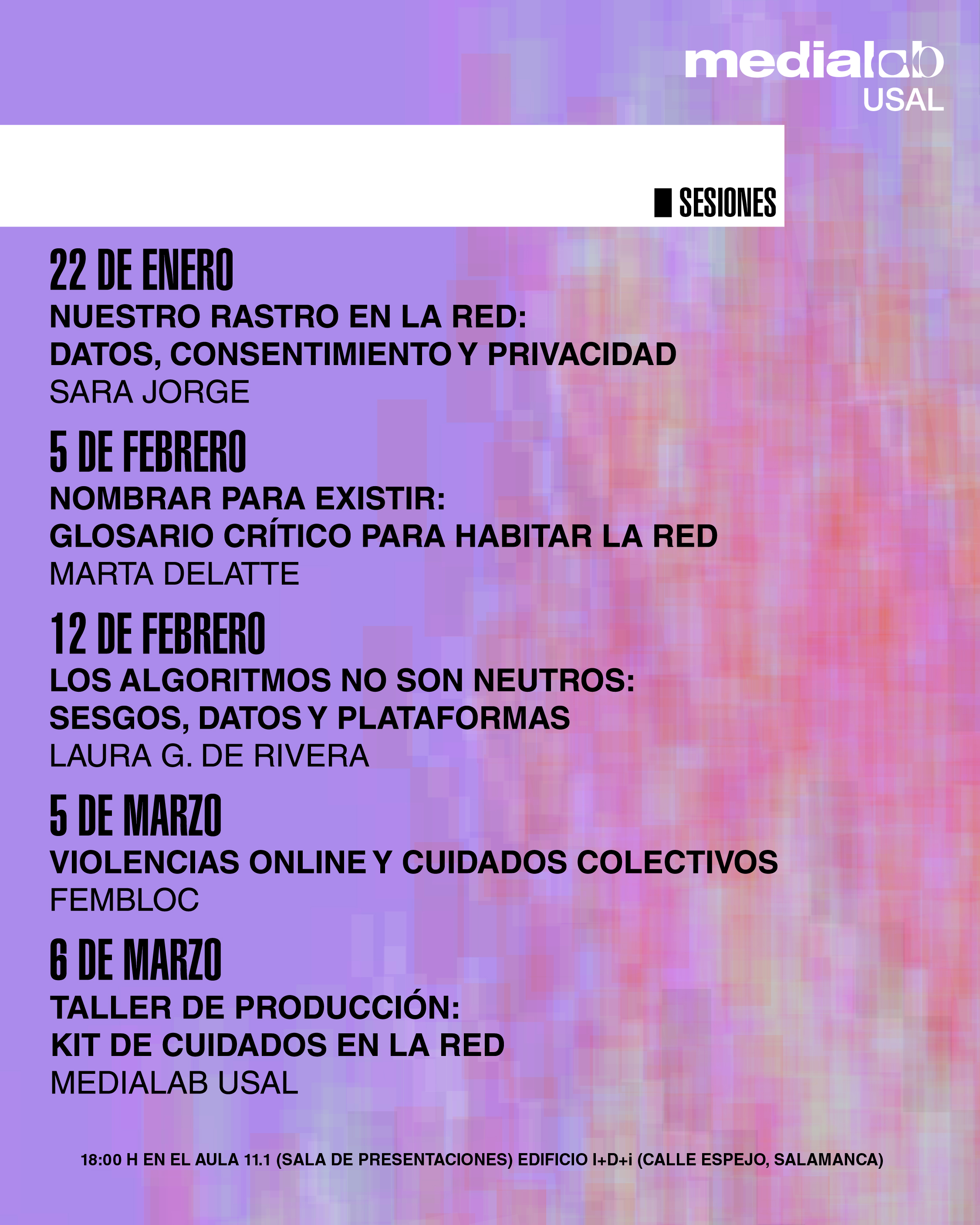 A lo largo del itinerario, los participantes construirán juntos un Kit de Cuidados en la Red, un recurso sencillo y práctico que incluirá un glosario crítico con términos clave y pequeños protocolos sobre qué hacer ante acoso, difusión no consentida de contenidos o suplantación de identidad. El programa contará con la participación de especialistas como Sara Jorge, de la Unidad de Propiedad Intelectual de la Universidad de Salamanca, (derechos, datos y licencias abiertas), Marta Delatte (investigadora y creadora digital), Laura G. de Rivera (periodista científica) y el proyecto FemBloc (línea feminista de atención y apoyo frente a las violencias digitales). El ciclo concluirá el 6 de marzo con un taller de producción final del Kit Cuidados en la Red.