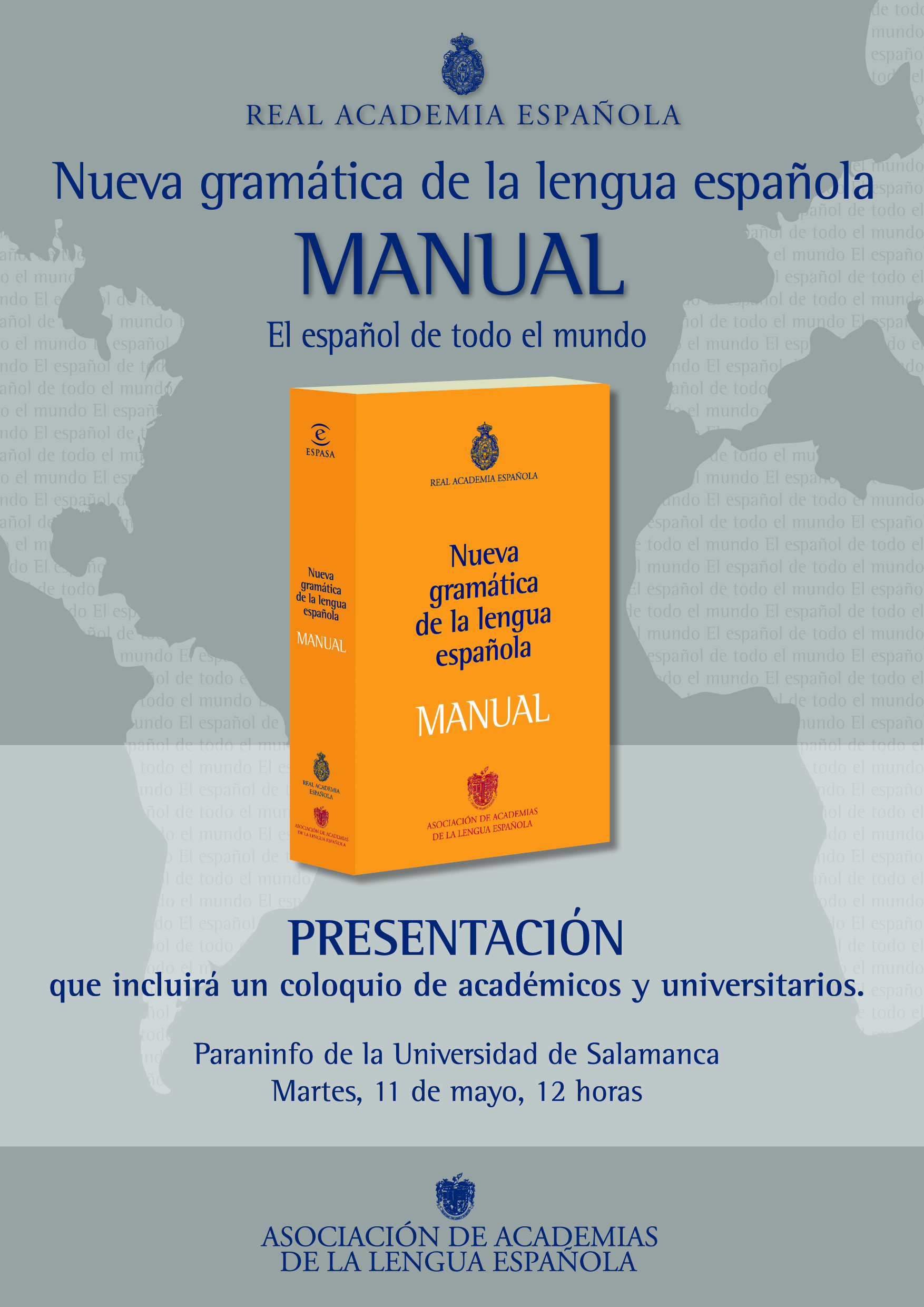 La Universidad de Salamanca acogerá la presentación del Manual de la Nueva Gramática de la Lengua Española el martes, 11 de mayo, a las 12 horas en el Paraninfo de las Escuelas Mayores.
