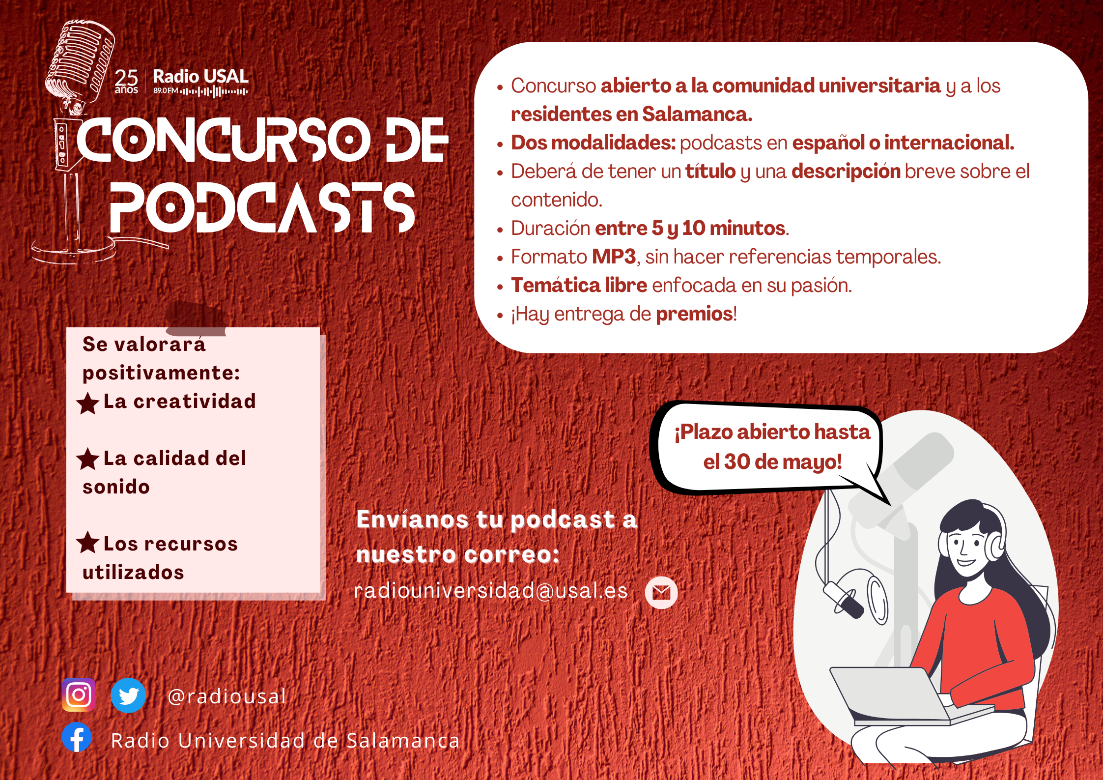 Todos los pódcast se deben de enviar por correo a: radiouniversidad@usal.es antes del 30 de mayo.