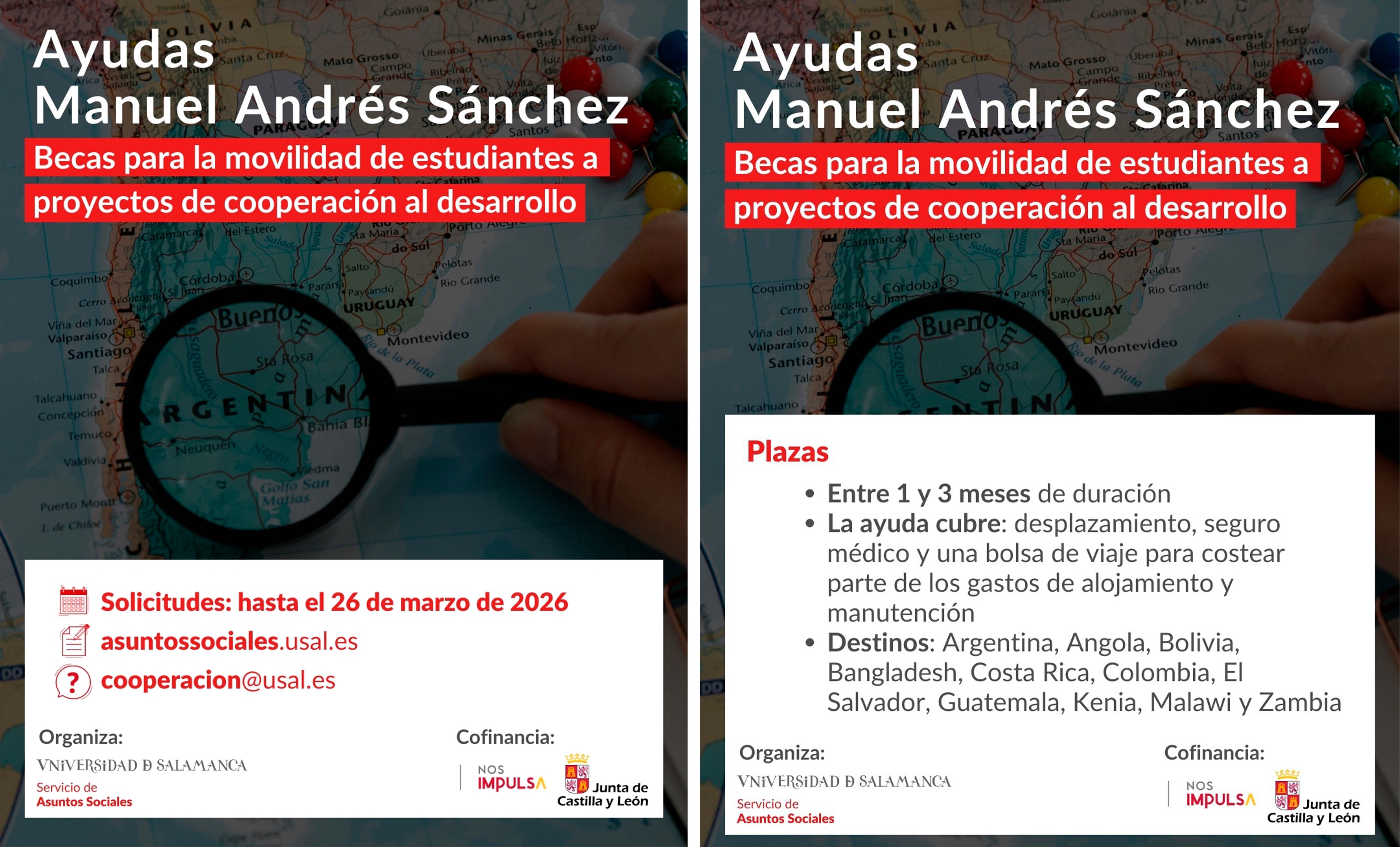 El Servicio de Asuntos Sociales de la Universidad de Salamanca abre la convocatoria de las Ayudas Manuel Andrés Sánchez, destinadas a apoyar la movilidad de estudiantes de la USAL que deseen participar en proyectos de cooperación al desarrollo en países de África, América Latina y Asia. Las solicitudes podrán presentarse hasta el 26 de marzo de 2026.