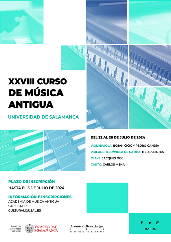La Universidad de Salamanca celebra esta semana la XXVIII edición de su Curso de Música Antigua, que se lleva a cabo en la Hospedería Fonseca a cargo de cinco profesores de violín, viola, violonchelo, clave y canto de la Academia de Música Antigua de la USAL.