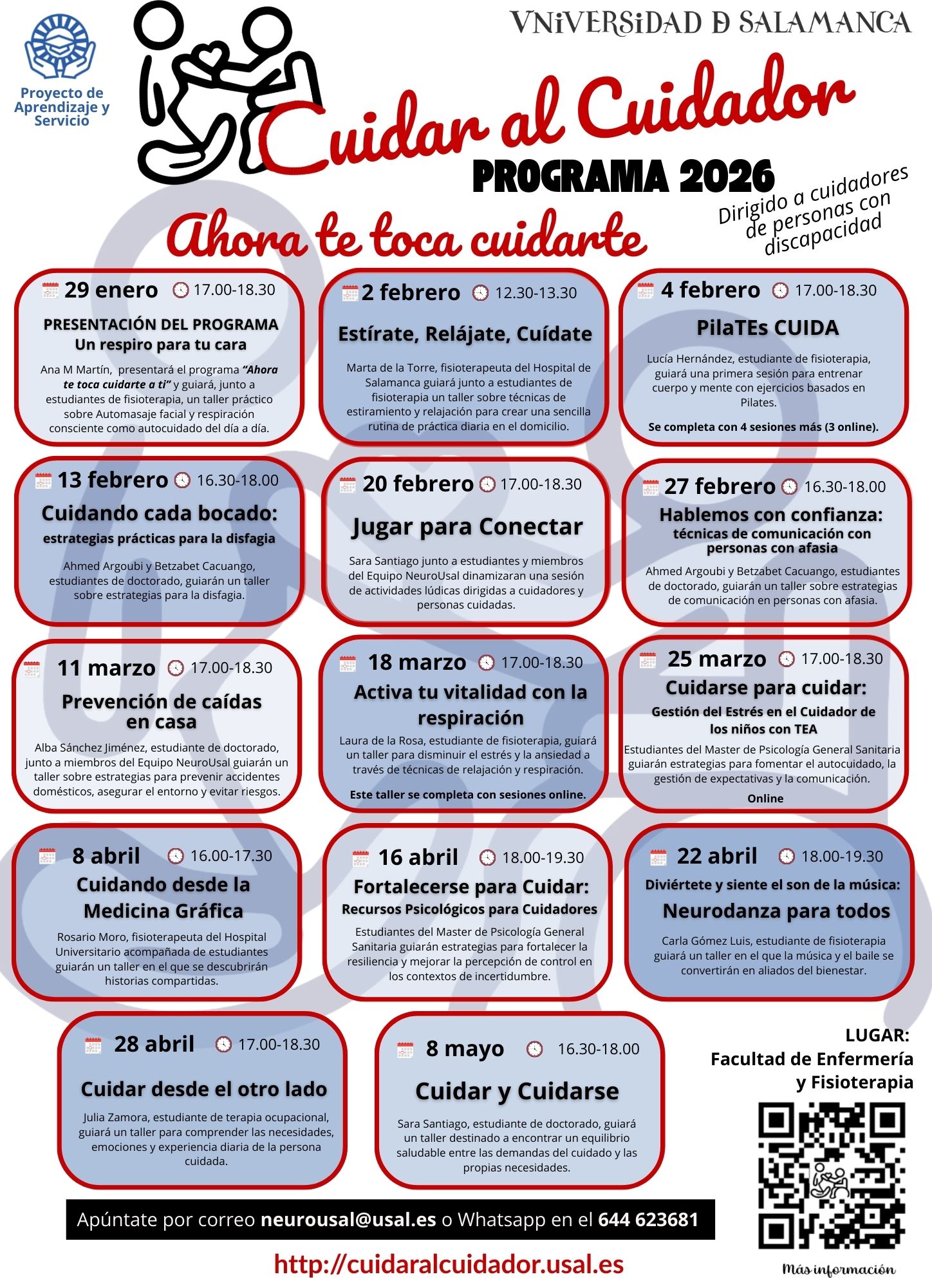 En este contexto, la Universidad de Salamanca pone en marcha entre el 28 de enero y el 8 de mayo una nueva edición de la iniciativa Aprendizaje y Servicio (ApS) "Cuidar al cuidador", que este curso se concreta en el programa voluntario y gratuito "Ahora te toca cuidarte" y está dirigido a cuidadores informales de personas con discapacidad.