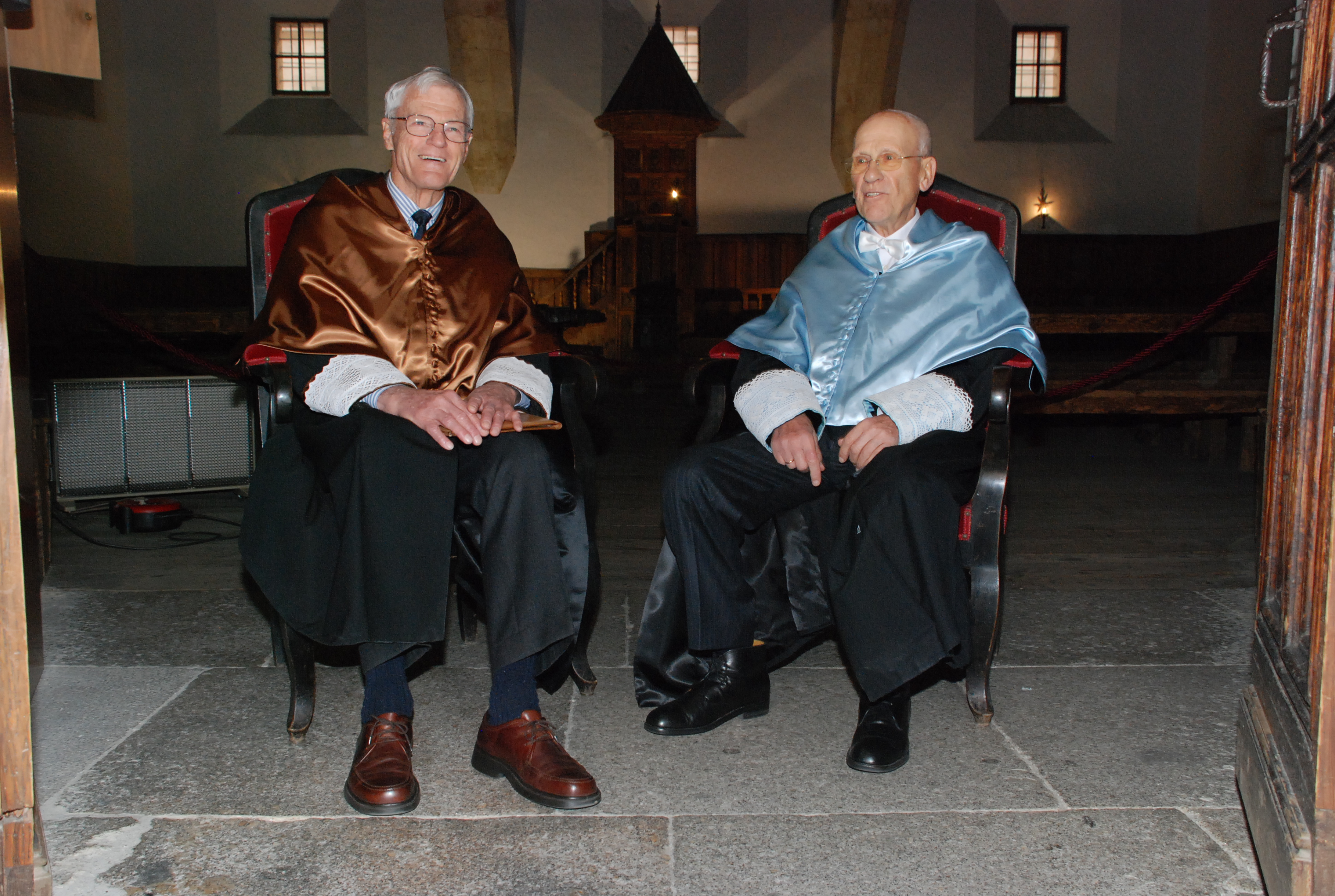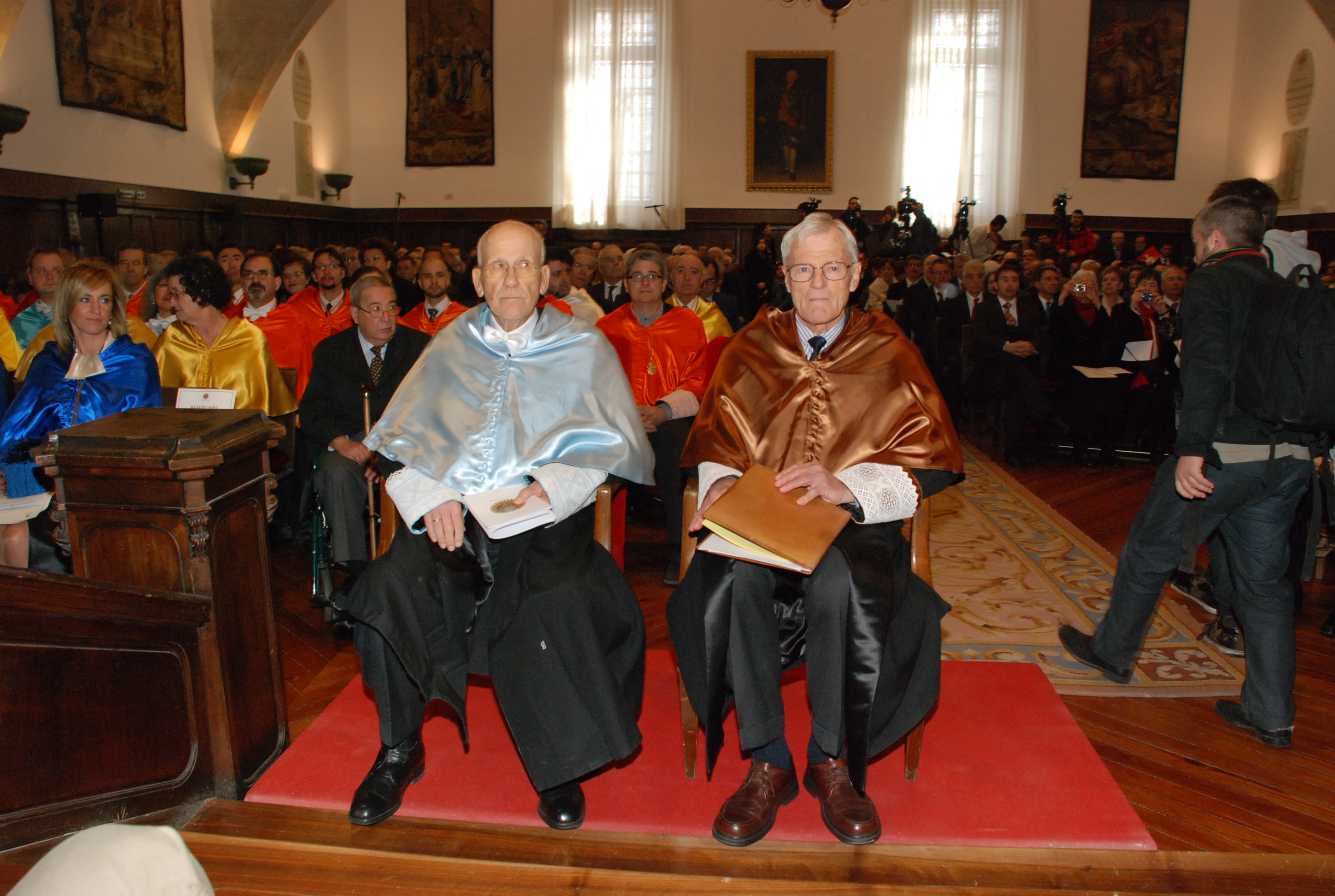 Salamanca, 10 de febrero de 2011. El científico y profesor de la Universidad de California Stephen Whitaker y el editor peñarandino Germán Sánchez Ruipérez han recibido esta mañana la máxima distinción que concede la Universidad de Salamanca, el doctor honoris causa, en una ceremonia presidida por el rector de la institución académica, Daniel Hernández Ruipérez, y cuya concesión fue aprobada el pasado 28 de diciembre. Los nuevos doctores han estado acompañados por Miguel Ángel Galán Serrano, catedrático del Departamento de Ingeniería Química y Textil de la Universidad, como padrino de Whitaker, y María José Rodríguez Conde, directora del Instituto Universitario de Ciencias de la Educación (IUCE) y madrina del editor salmantino.